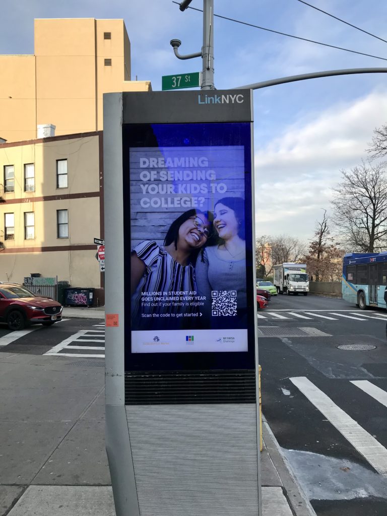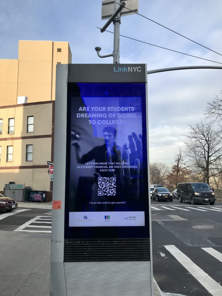 We discovered that Intersection – the company that manages the advertising on these portals — is mandated to use a portion of the advertising space for public purposes. Typically, the “public purpose” is solely dedicated to organizations with a “.gov” address. But that shouldn’t be the case. So Heckscher advocated for its use for EdTrust — to help it promote guidance on how to complete the Free Application for Student Aid (“FAFSA”) in key areas in the Bronx and Queens.  This guidance is in particular need for long-income students whom are least likely to complete the form — a form that is of particular significance for receiving financial aid for college. Many potential college students who do not complete the FAFSA fail to reach college at all.